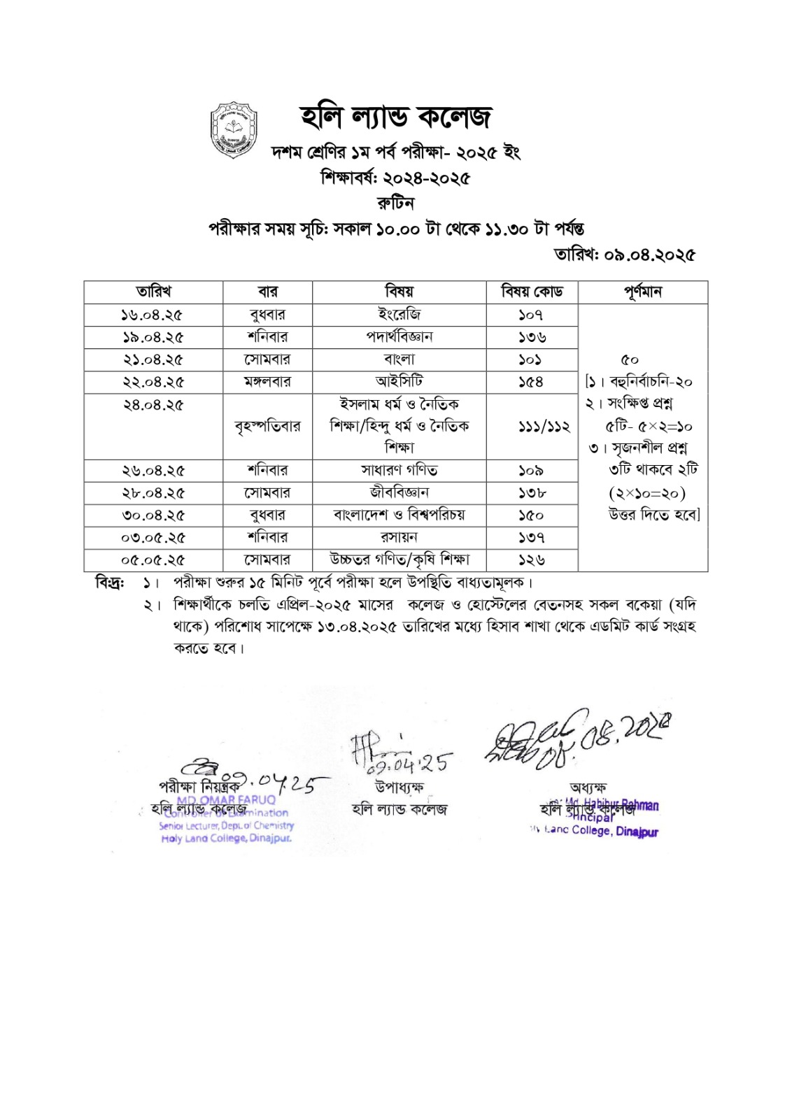 দশম শ্রেণির ১ম বর্ষ পরীক্ষার সময়সূচি-২০২৫