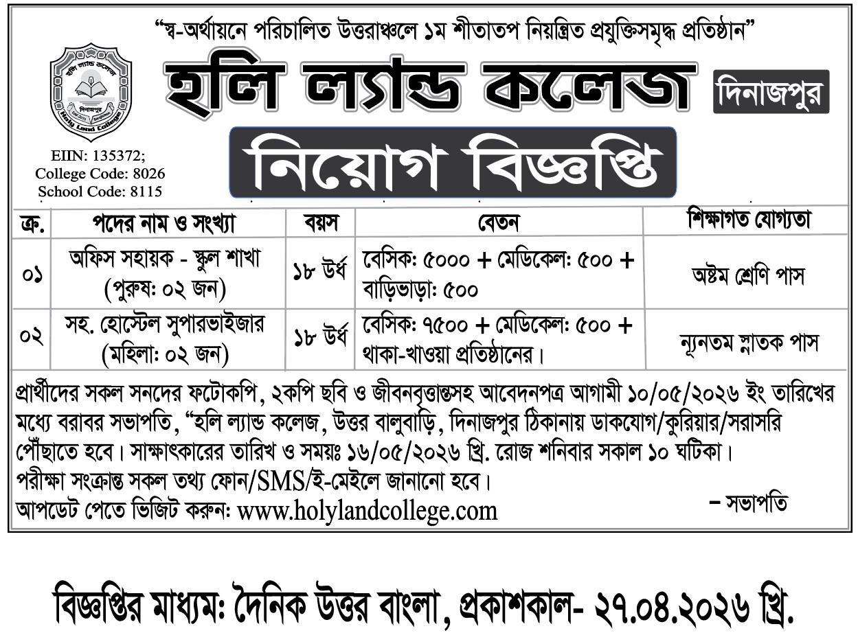 অফিস সহায়ক ও হোস্টেল সুপারভাইজার পদে নিয়োগ বিজ্ঞপ্তি।