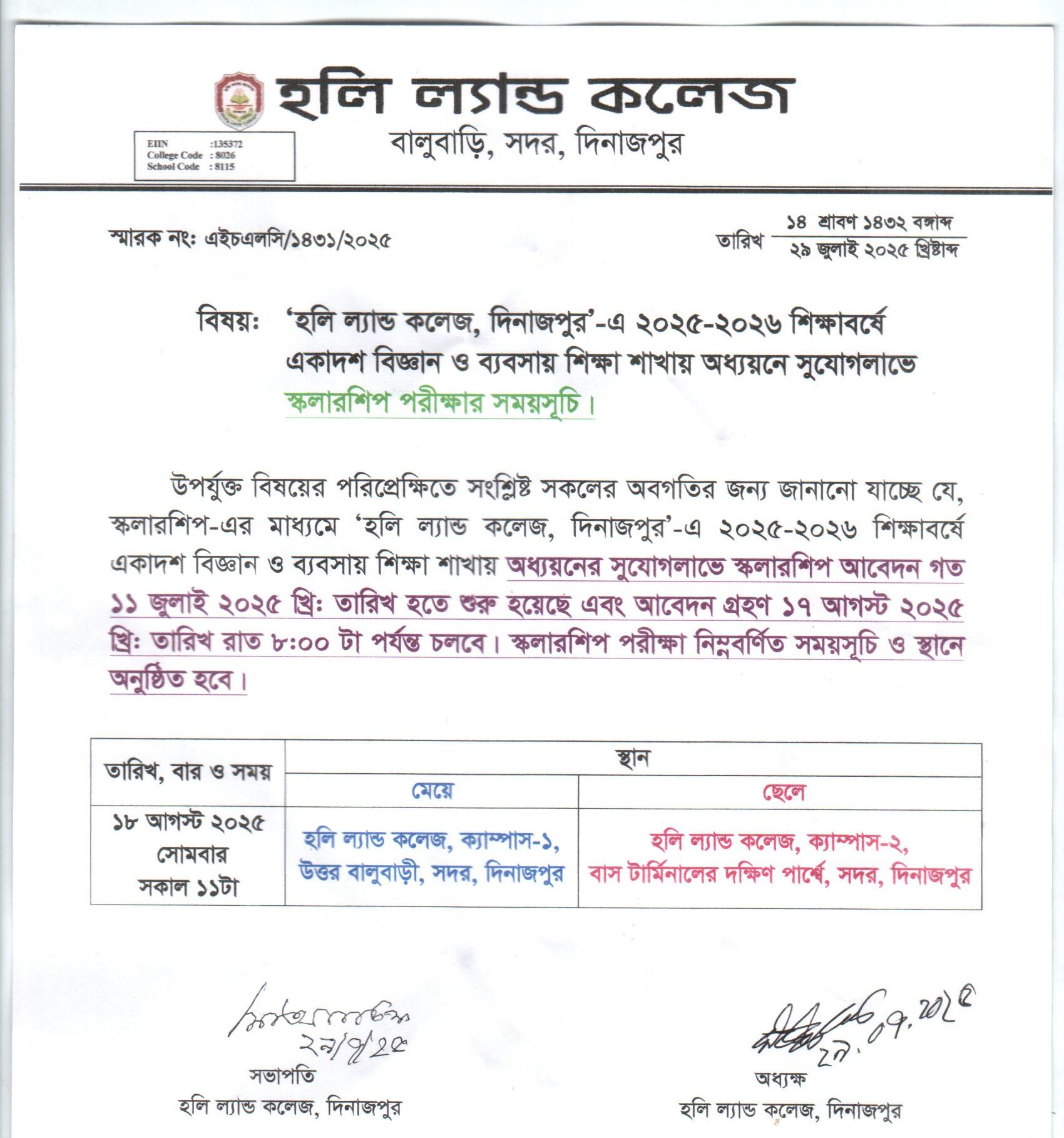 ২০২৫-২০২৬ শিক্ষাবর্ষে একাদশ শ্রেণিতে ভর্তির ন্যূনতম জিপিএ // বিজ্ঞান শাখা ৪.৭২ // ব্যবসায় শিক্ষা শাখা ৩.০০ // একাদশ শ্রেণিতে ৭০ জন ছাত্র-ছাত্রীকে স্কলারশিপ প্রদান করা হবে // আবেদনের শেষ তারিখ: ১৭-৮-২৫ // পরীক্ষার তারিখ: ১৮-৮-২৫; সময়: ১১ ঘটিকা।